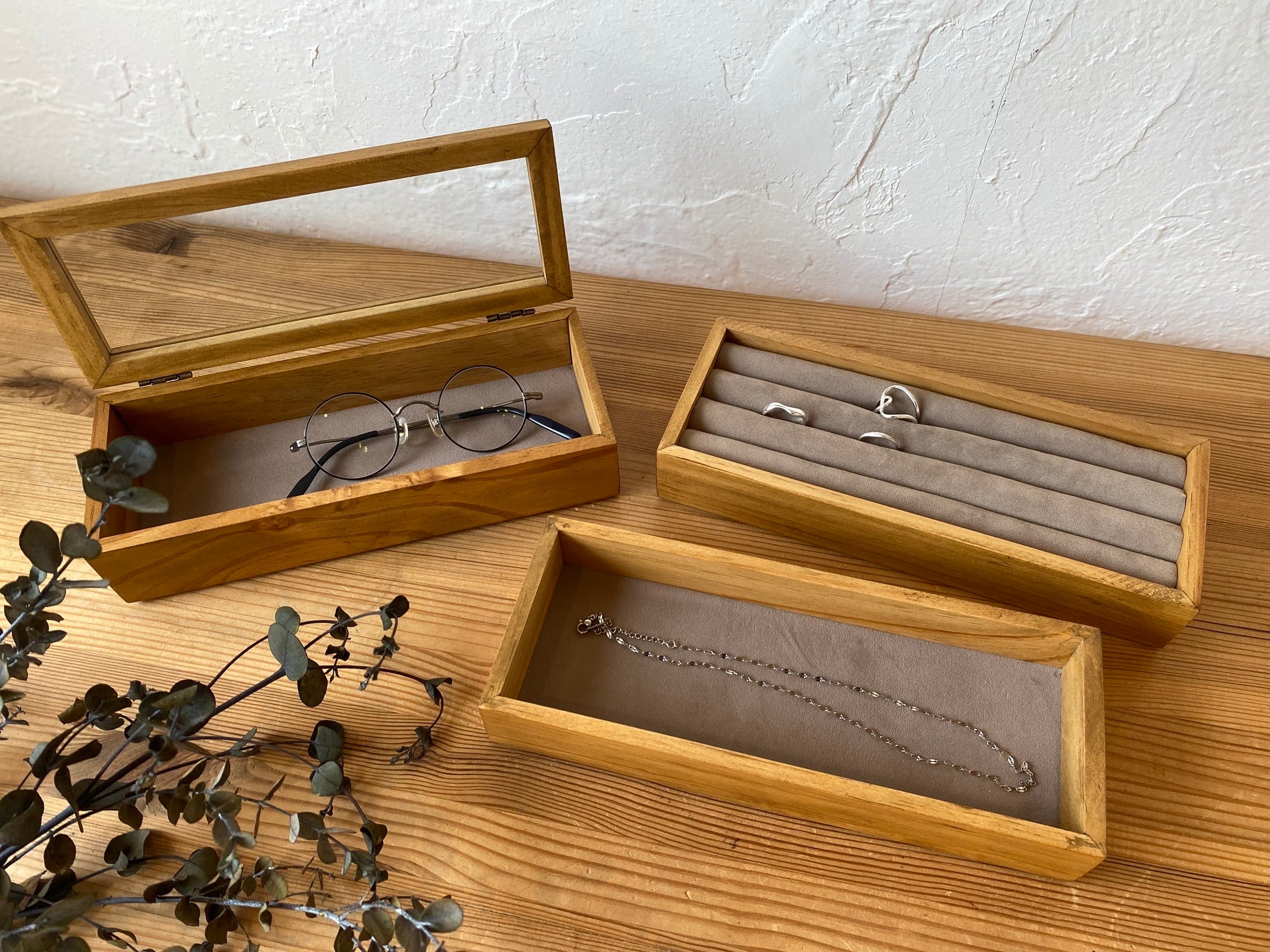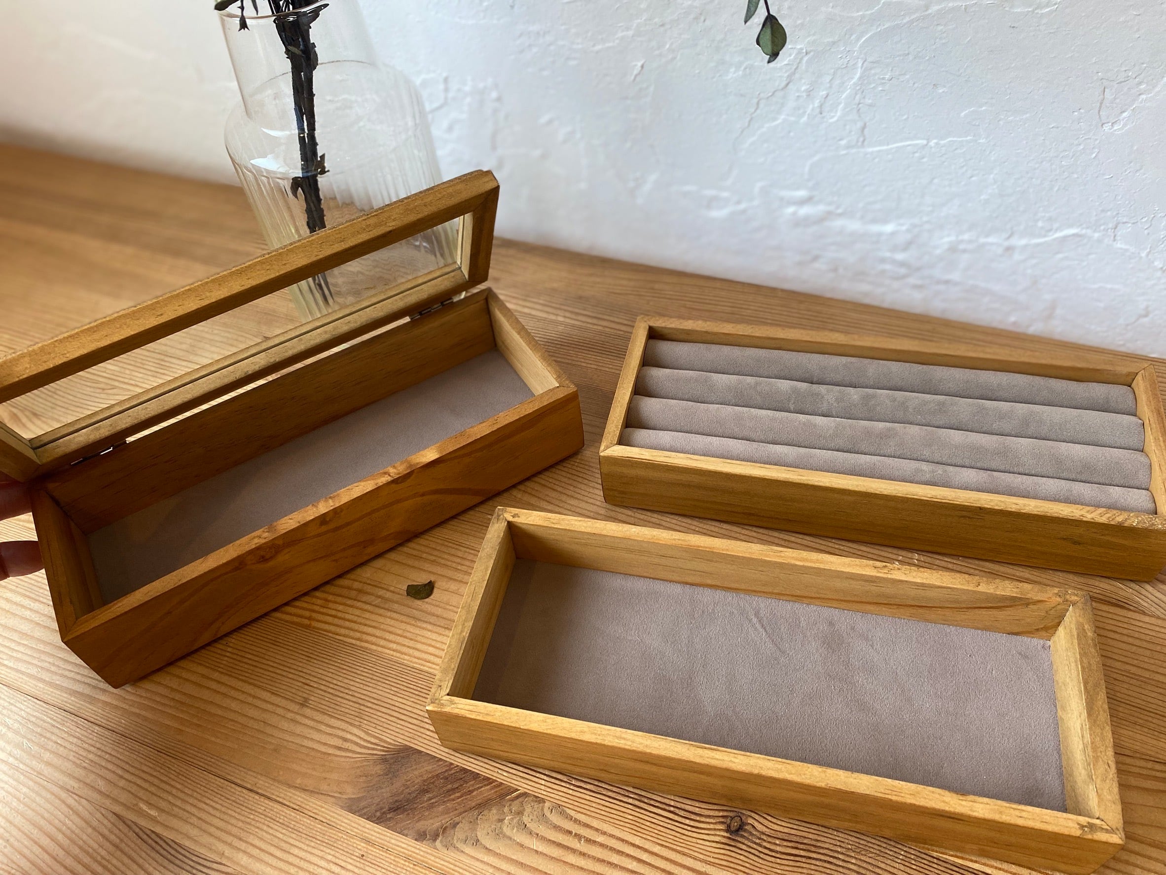 1段目はガラス蓋付きで、中のアクセサリーをひと目で確認できるデザイン。