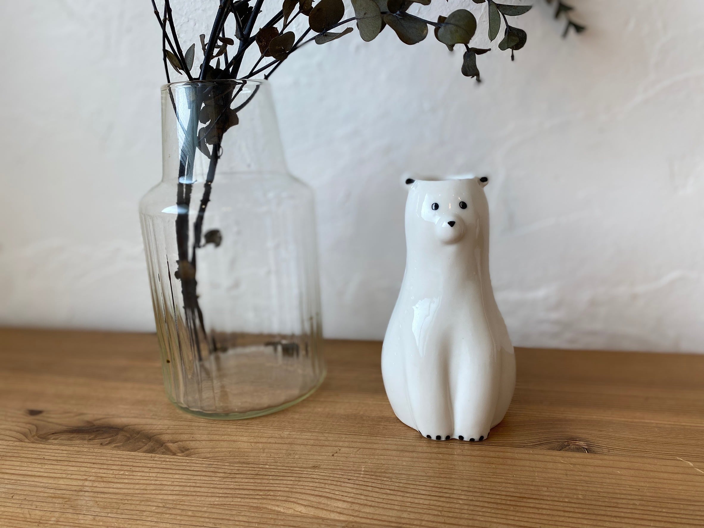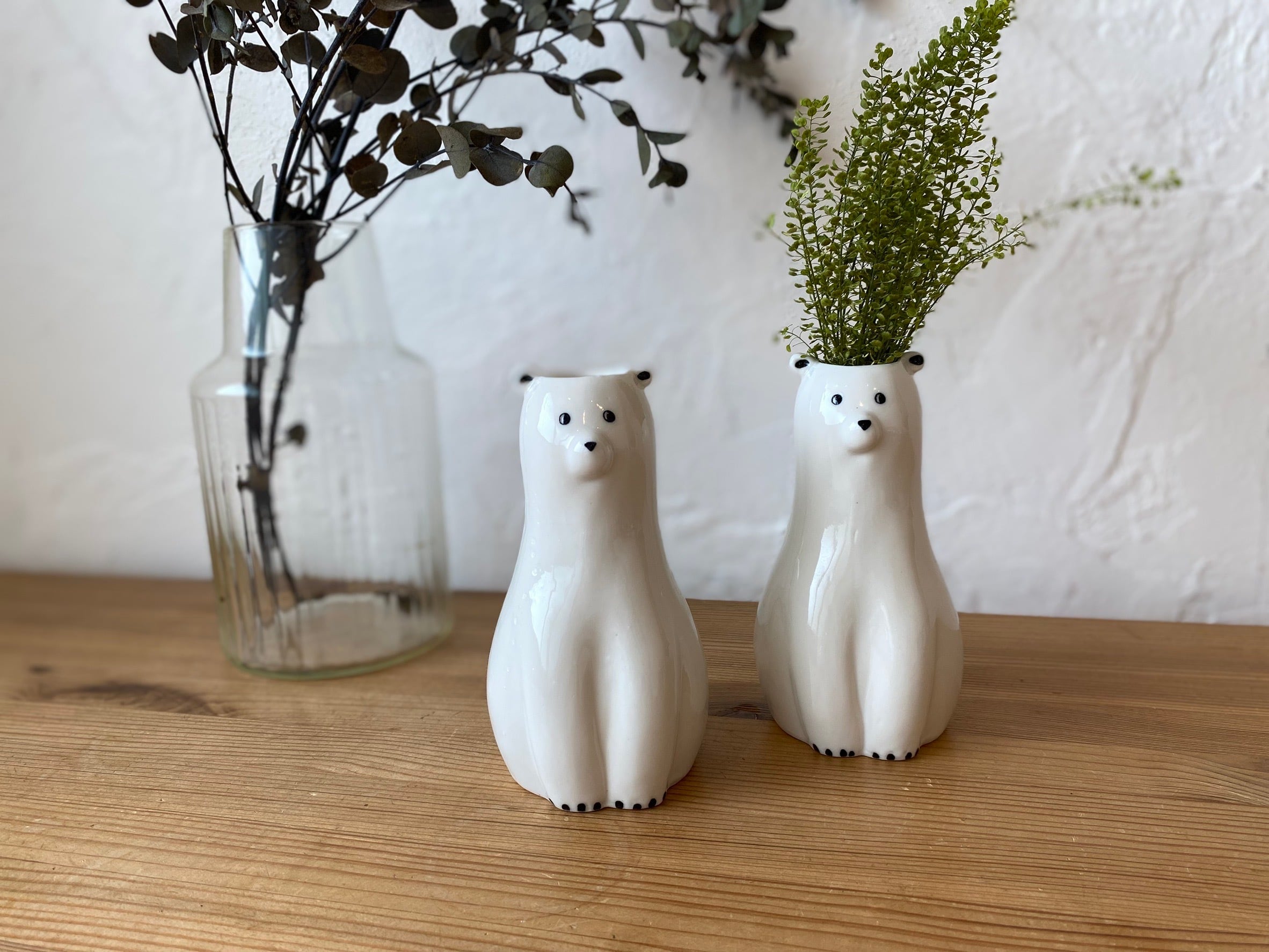 白い磁器で出来たぽってりとした丸い体に、黒の釉薬を使いハンドメイドで動物の表情を仕上げました。
