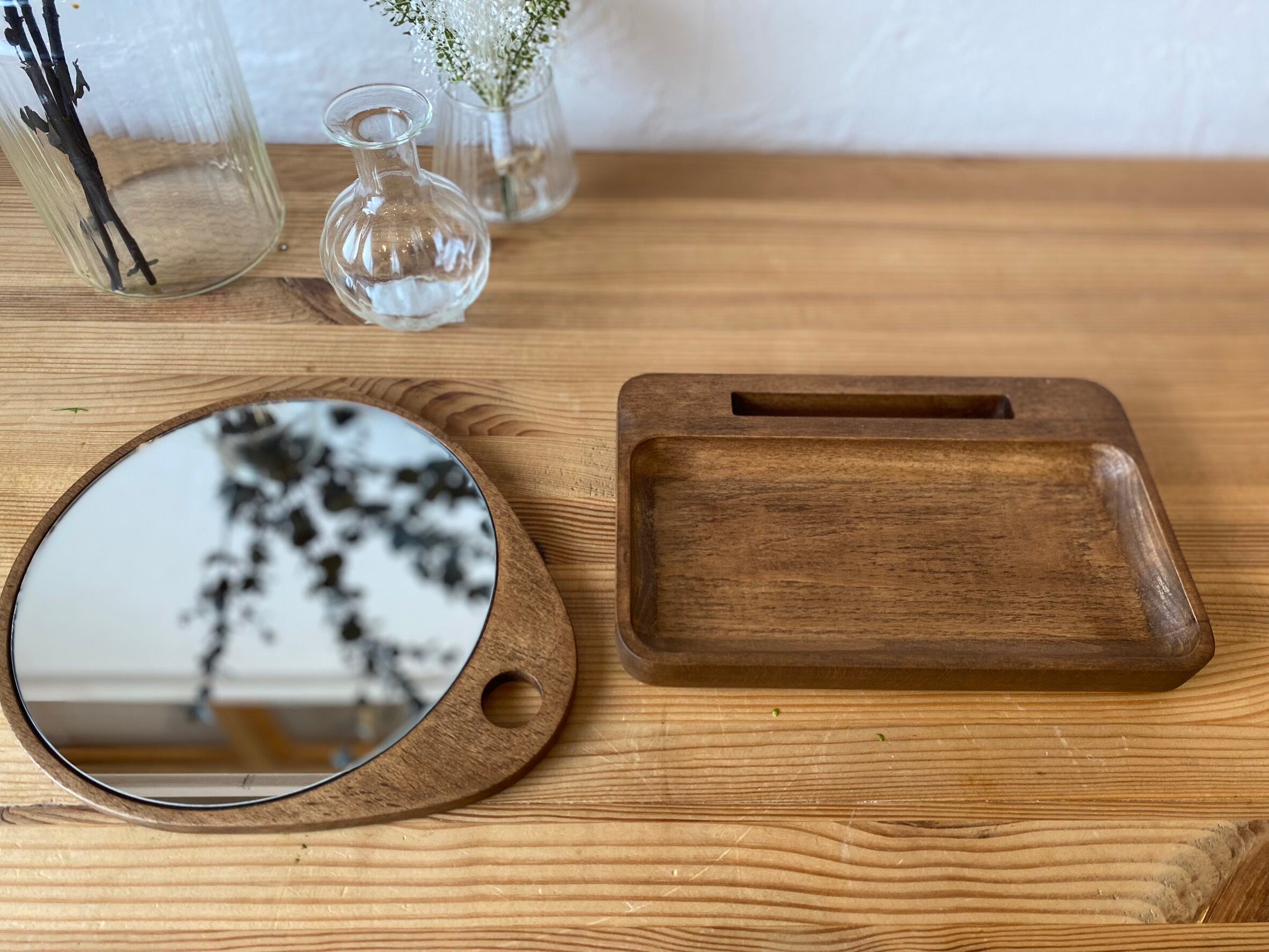 ウッドトレーがついた丸い卓上ミラー