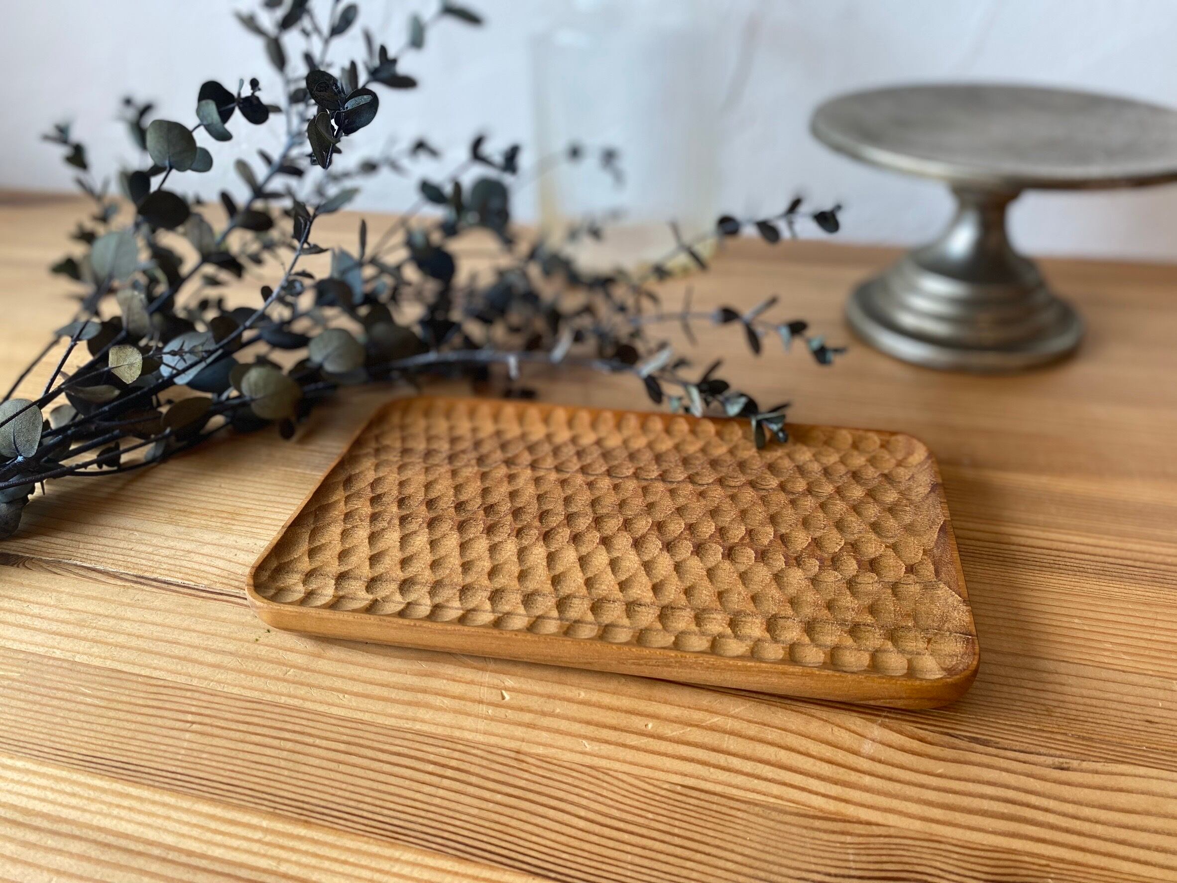 シンプルな長方形と丸のトレーに職人技の彫り加工が映えるトレー