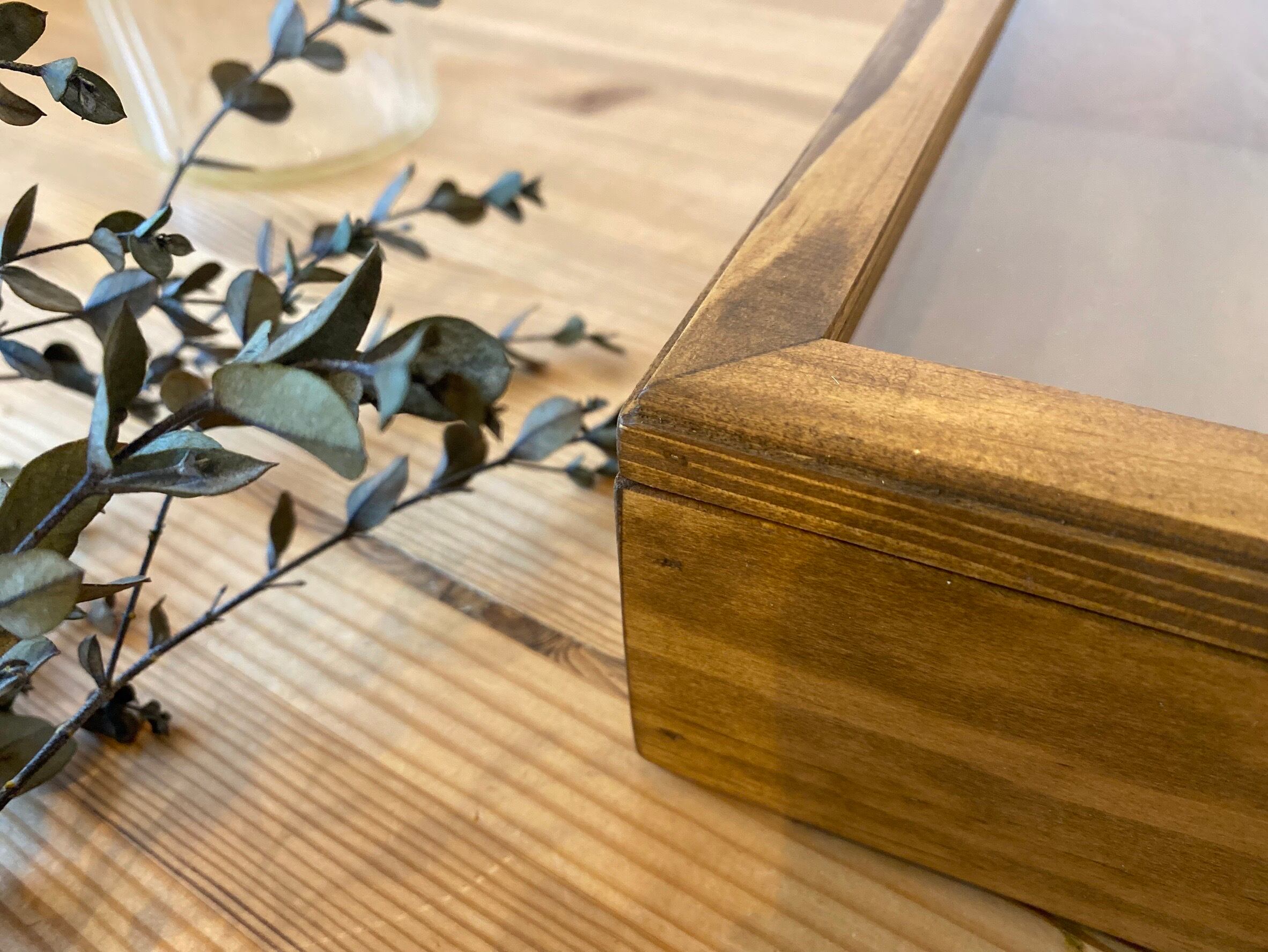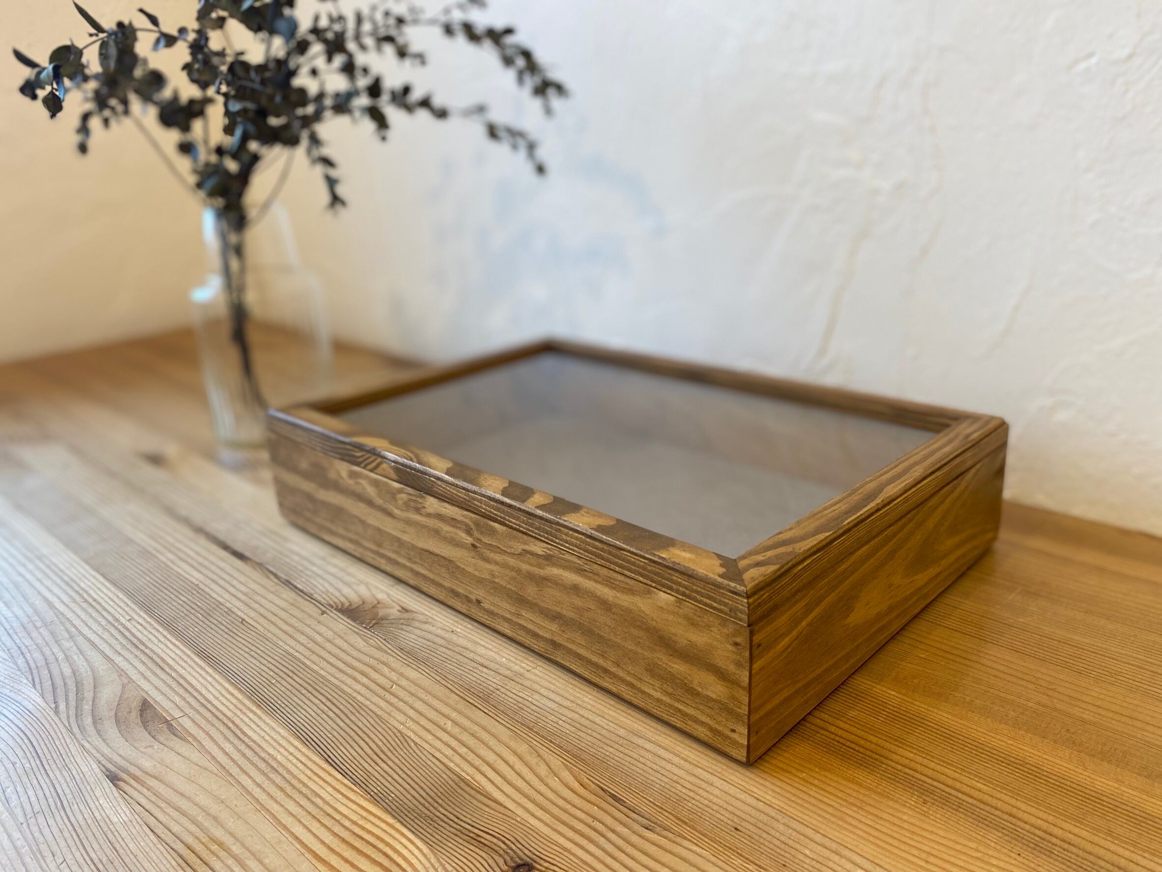 ガラスとパイン材を組み合わせた、アンティークな雰囲気のあるアクセサリーケース。