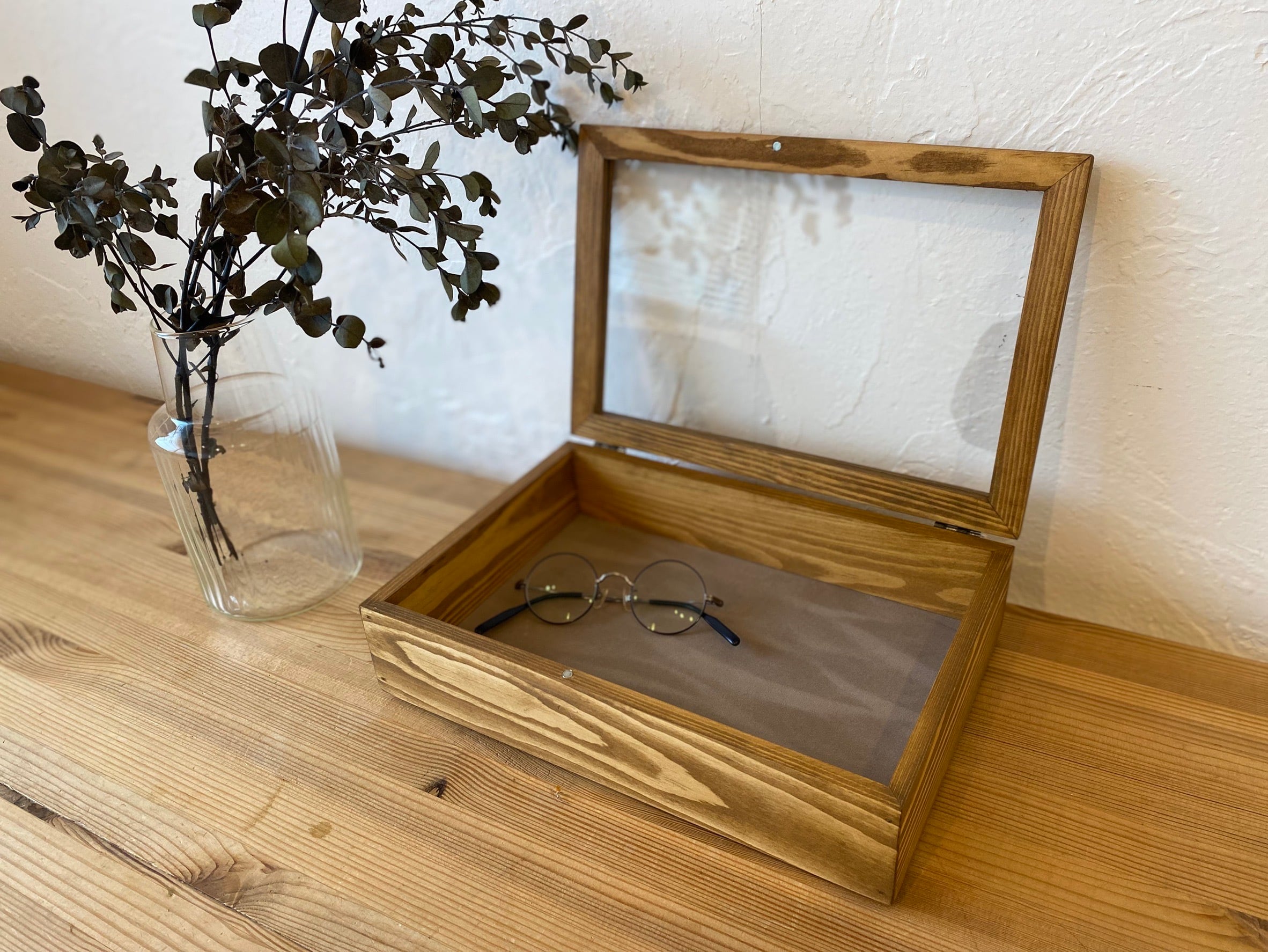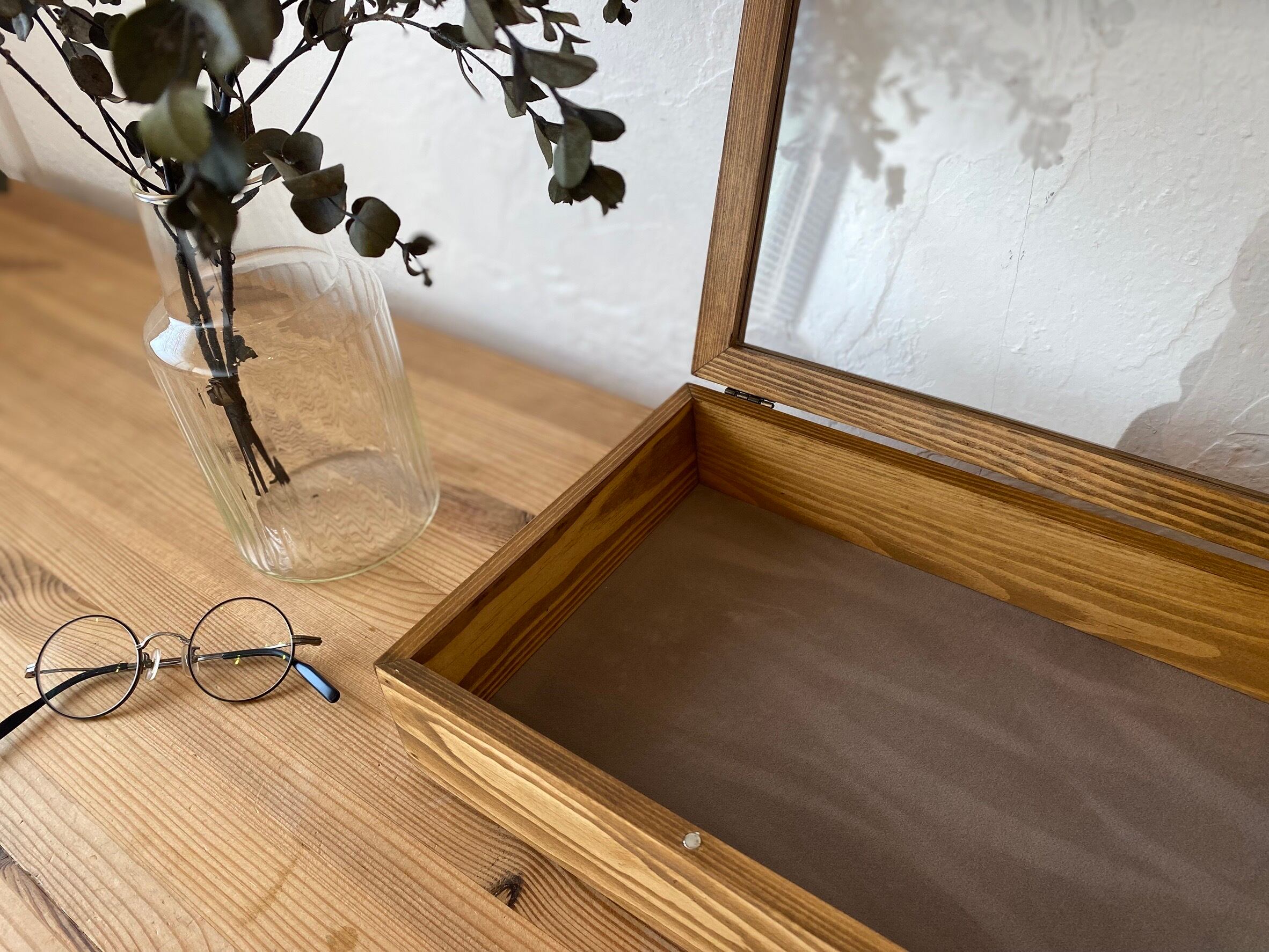 ガラスとパイン材を組み合わせた、アンティークな雰囲気のあるアクセサリーケース。